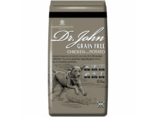 Dr John Grain-Free Dog Food is a completely grain-free food formulated for sporting and working dogs that require a sensitive diet or those dogs that have difficulty in digesting cereals. The formulation is built upon an excellent chicken base of 33%. This contributes to the protein level of 25% and an oils and fats level of 10.5%, making it an ideal feed for working dogs and well-exercised dogs from 8 months upwards. As well as chicken and potato, the recipe contains vegetables and gravy.