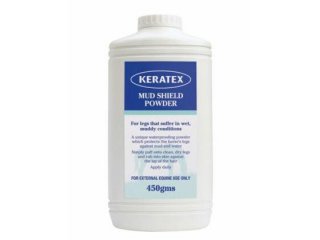 Keratex Mud Shield Powder is a highly-acclaimed, handy, easy-to-use powder which you puff onto horse's legs for a cleansing and waterproofing action on legs which are prone to scabs and broken skin in wet and muddy conditions. This light talc will give your horse's legs a breathable, resilient coat of powder that does not absorb water (and therefore does not become sticky). It also works by making the leg hair so silky that mud cannot grip on to hair or soften the skin underneath. Further to this it will assist the horse's natural defences against anything from mud and environmental water (such as muddy puddles and boggy fields) that might get into breaks in the skin and cause problems. This respected product is widely recognised by the equestrian community as a leader in its field.