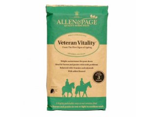 Veteran Vitality[[169]] has been specially formulated for horses and ponies from the first signs of ageing. Using only the finest Non-GM ingredients, Veteran Vitality[[169]] provides all the nutritional requirements for optimum health in older horses and ponies. Veteran Vitality[[169]] is high in fibre but low in starch, making it 'kinder' on the digestive system. A unique pre and probiotic blend, is included to help maintain a healthy digestive system and linseed is added as a source of Omega 3. Veteran Vitality[[169]] is highly palatable, even to fussy feeders and has a good calorie level to help with weight maintenance